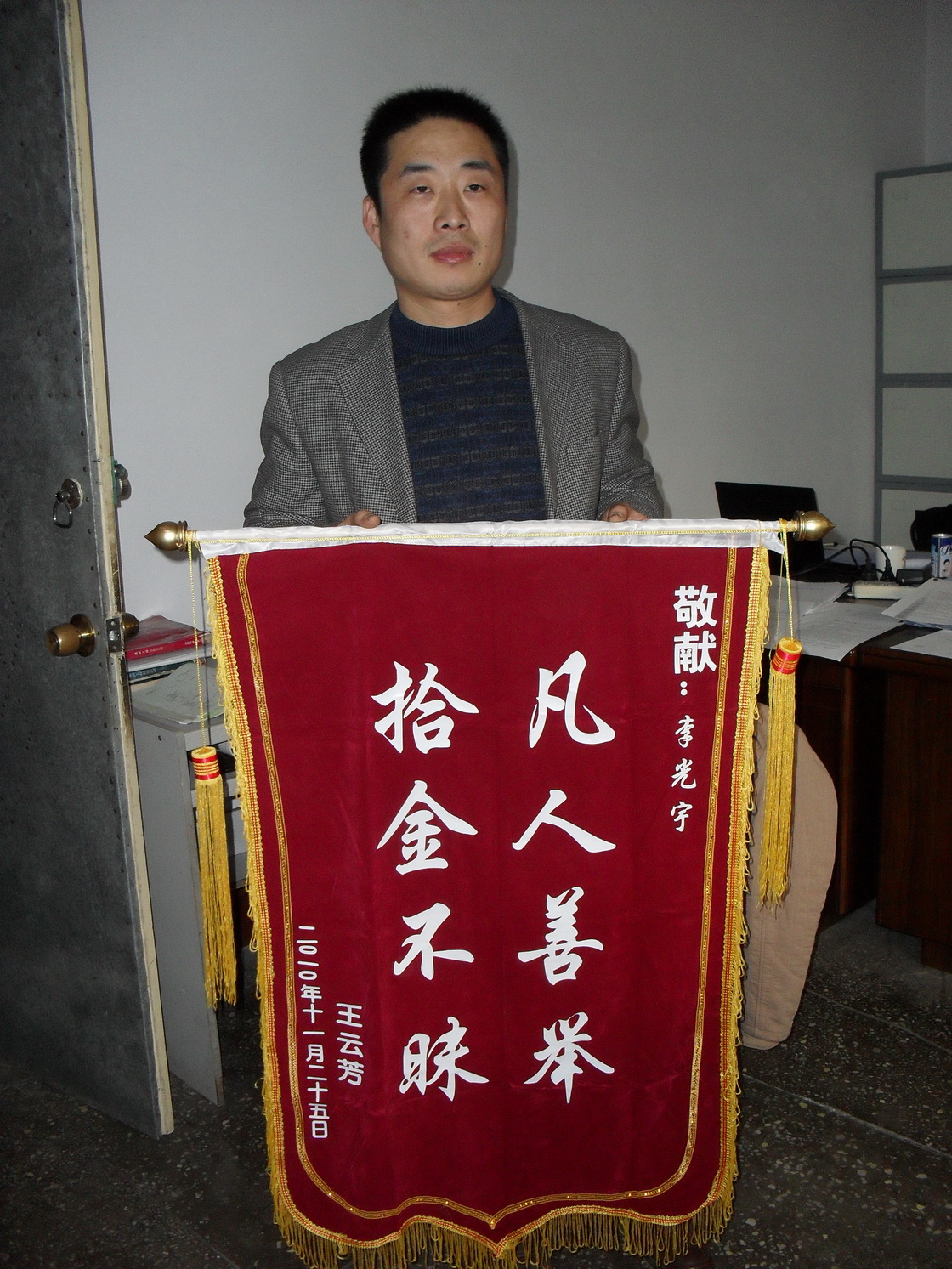 次日,為了再次對李光宇同志拾金不昧的事跡表示感謝,失主還千方百計的找到我公司的具體地址,并送上一面錦旗,我們對李光宇同志拾金 不昧的精神表示深深的敬意!